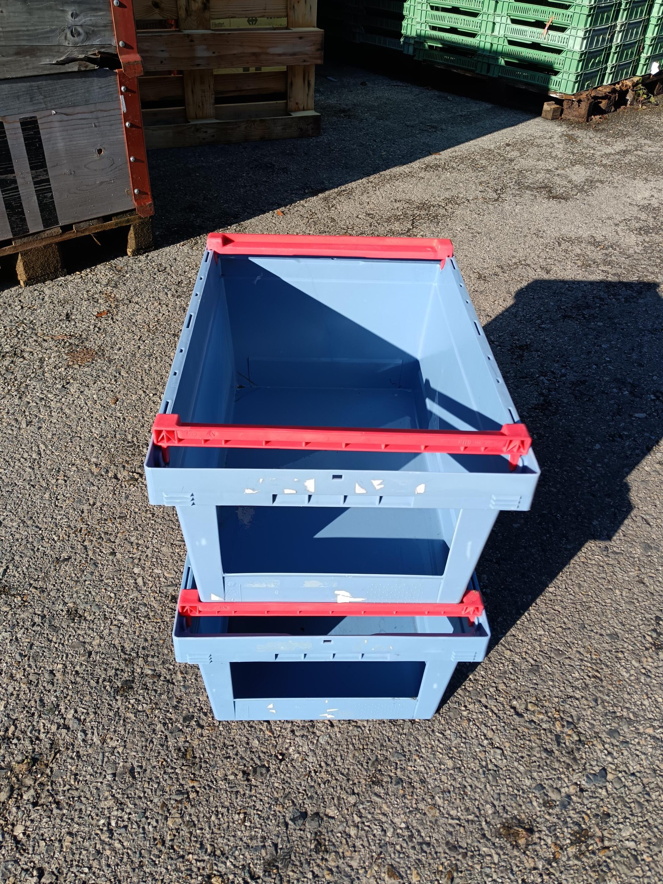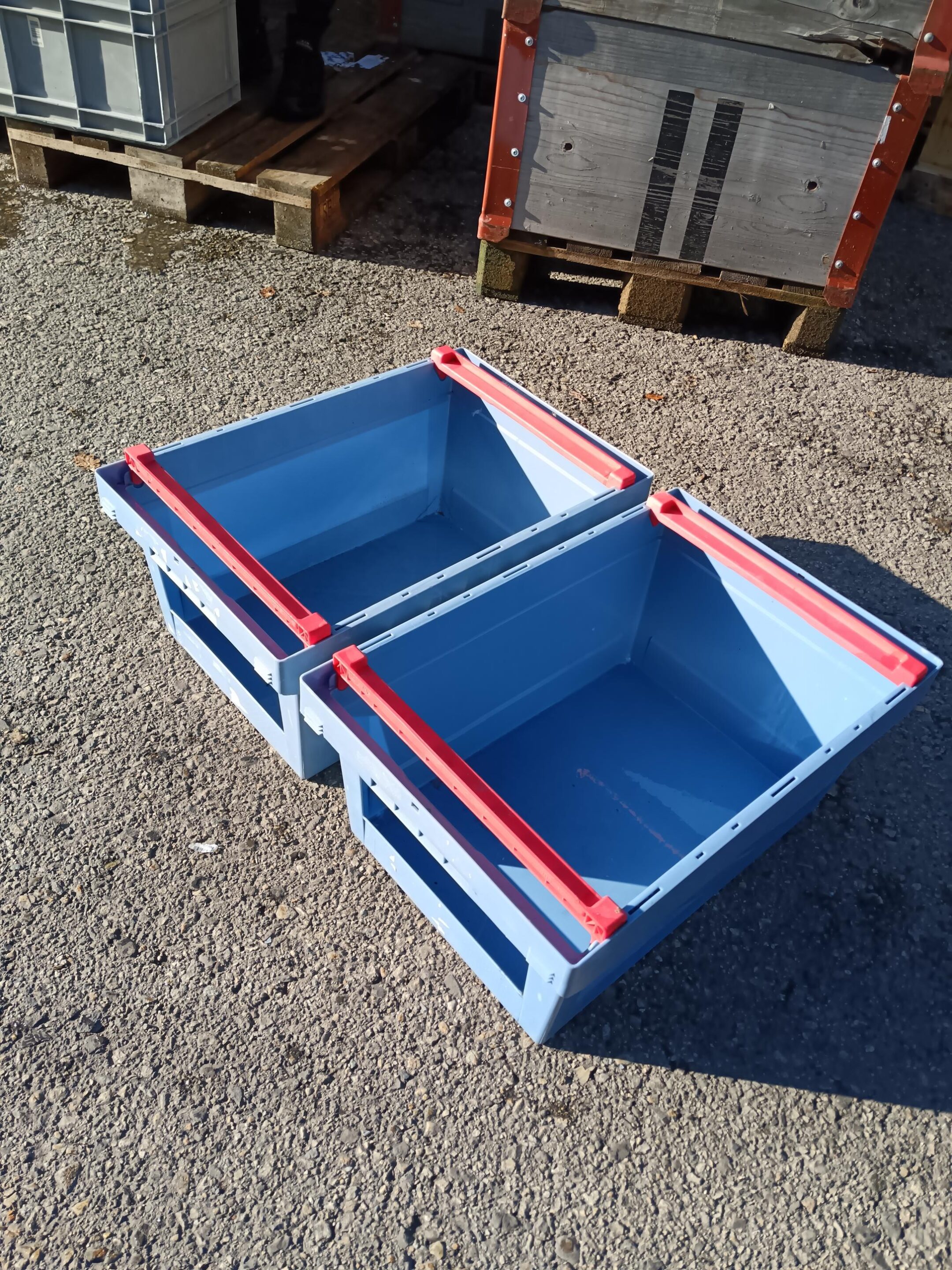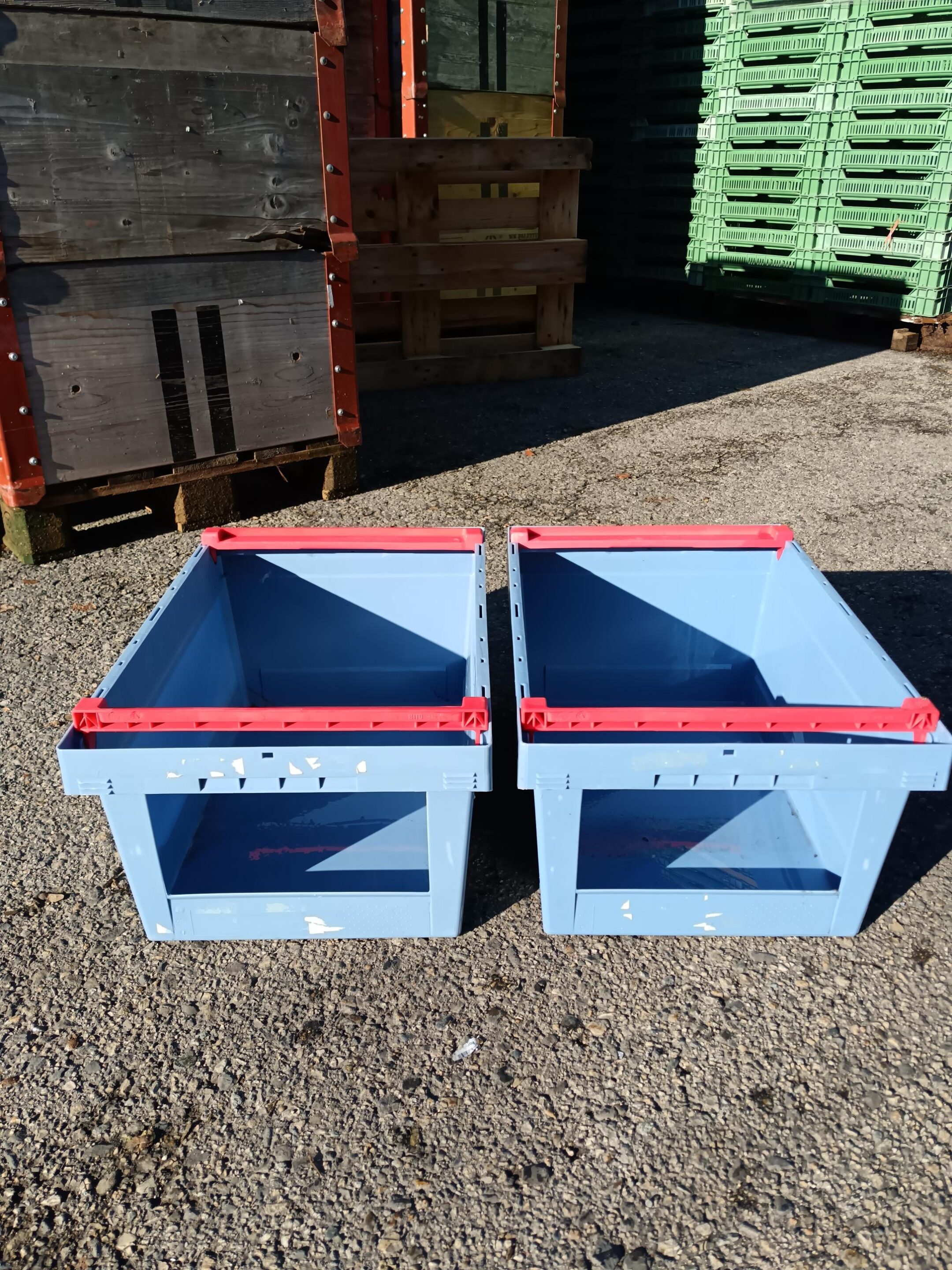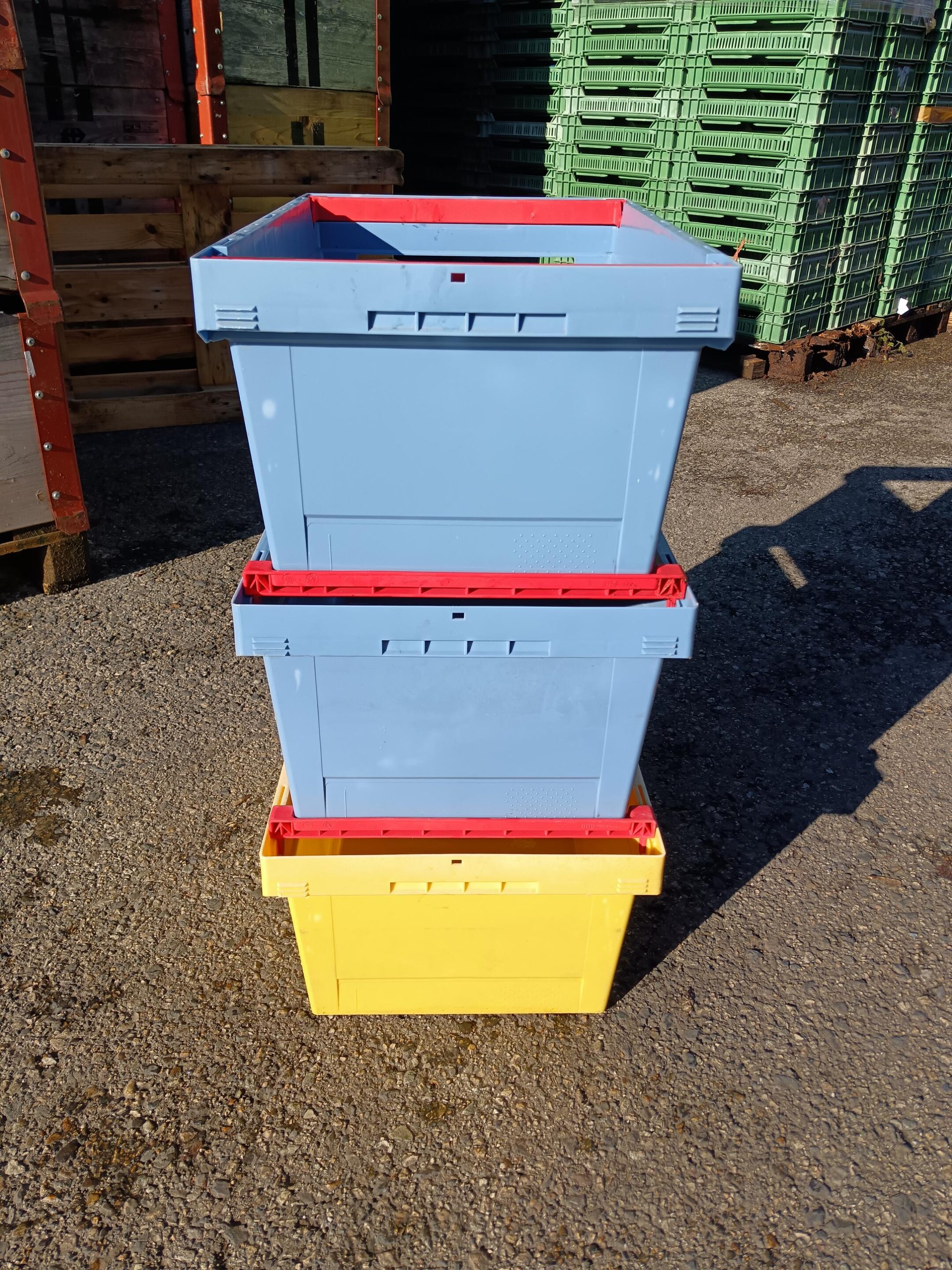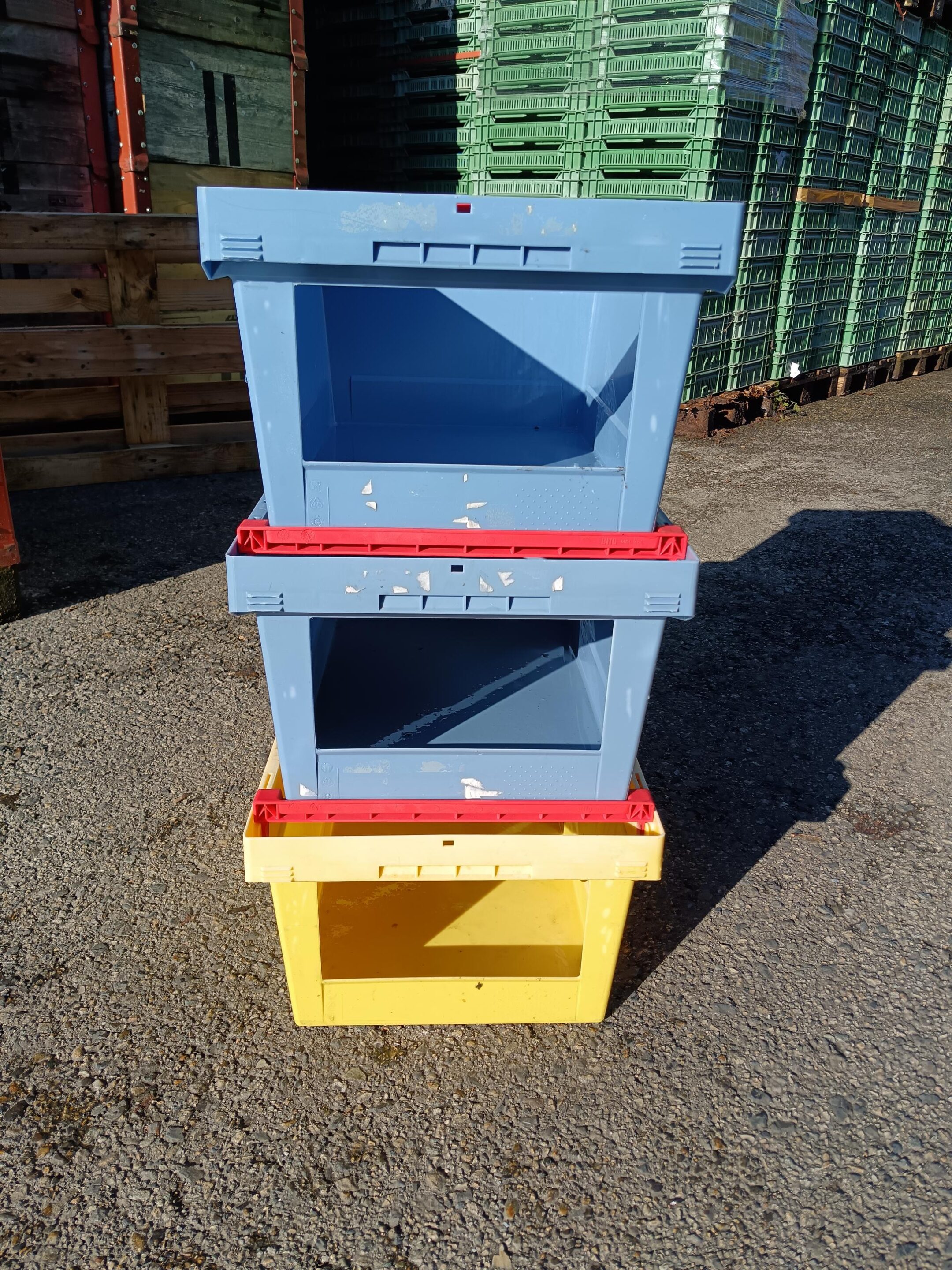 Gebrauchte blaue und gelbe Kunststoffboxen mit oder ohne Öffnung – 60 x 40 x 30 cm