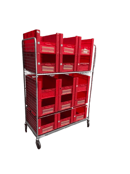 PraktischerRollcontainer mit rotem Sichtlagerkasten, perfekt für die Aufbewahrung und Organisation in der Werkstatt oder im industriellen Umfeld. Seine robuste Struktur und die Rollen erleichtern das Bewegen und den Zugriff auf die gelagerten Werkzeuge oder Teile.