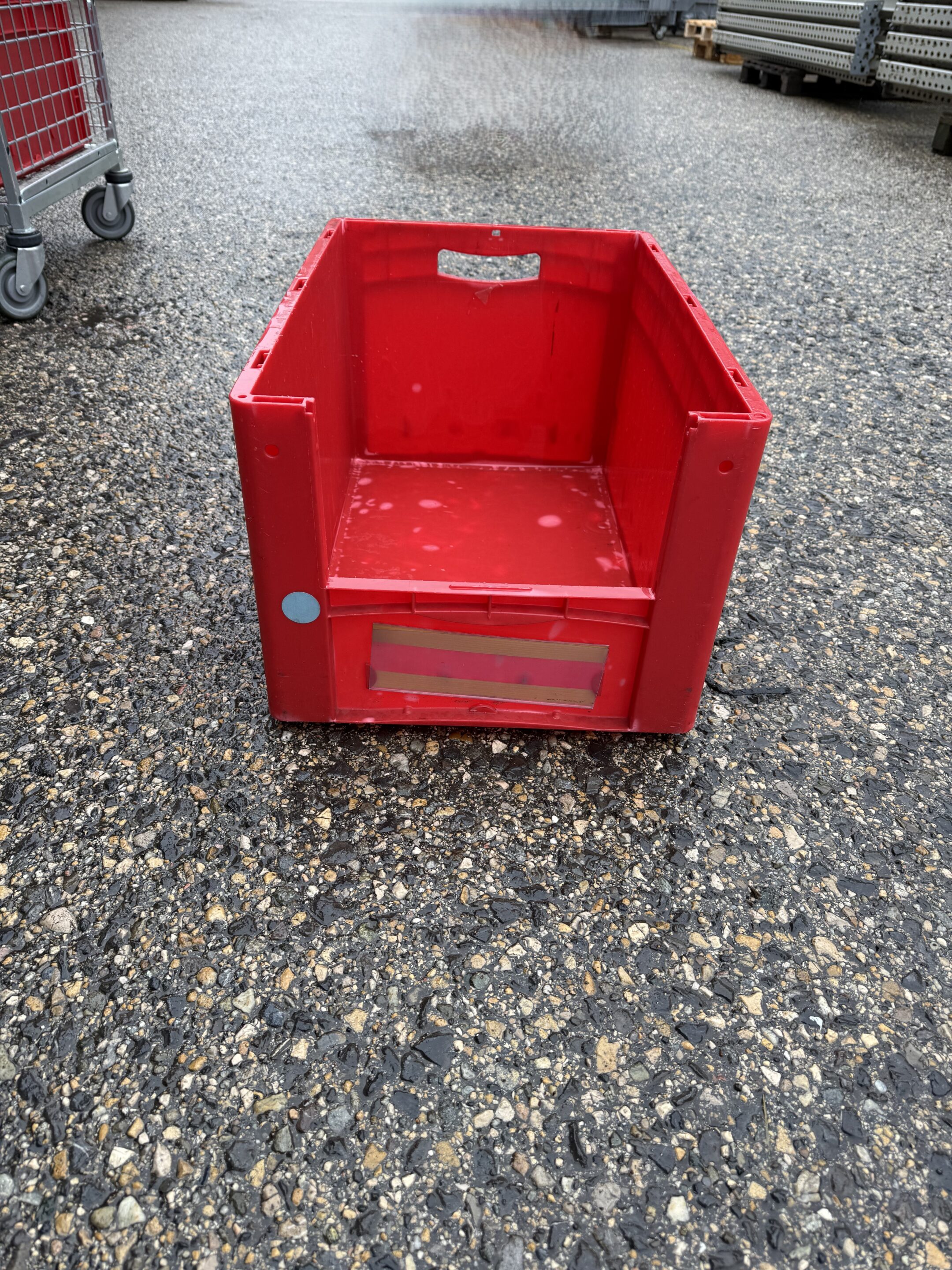 Rote Plastikaufbewahrungsbox halb offen – 60 x 39 x 30,5 cm